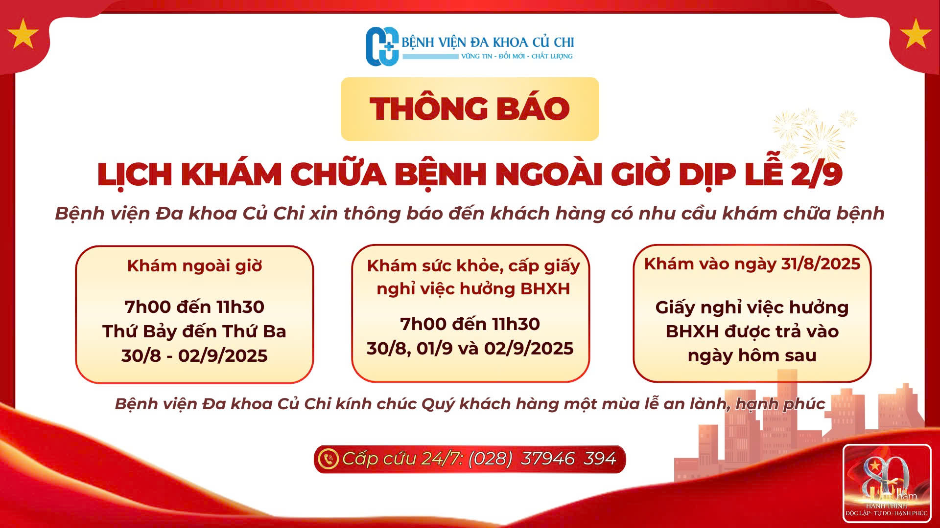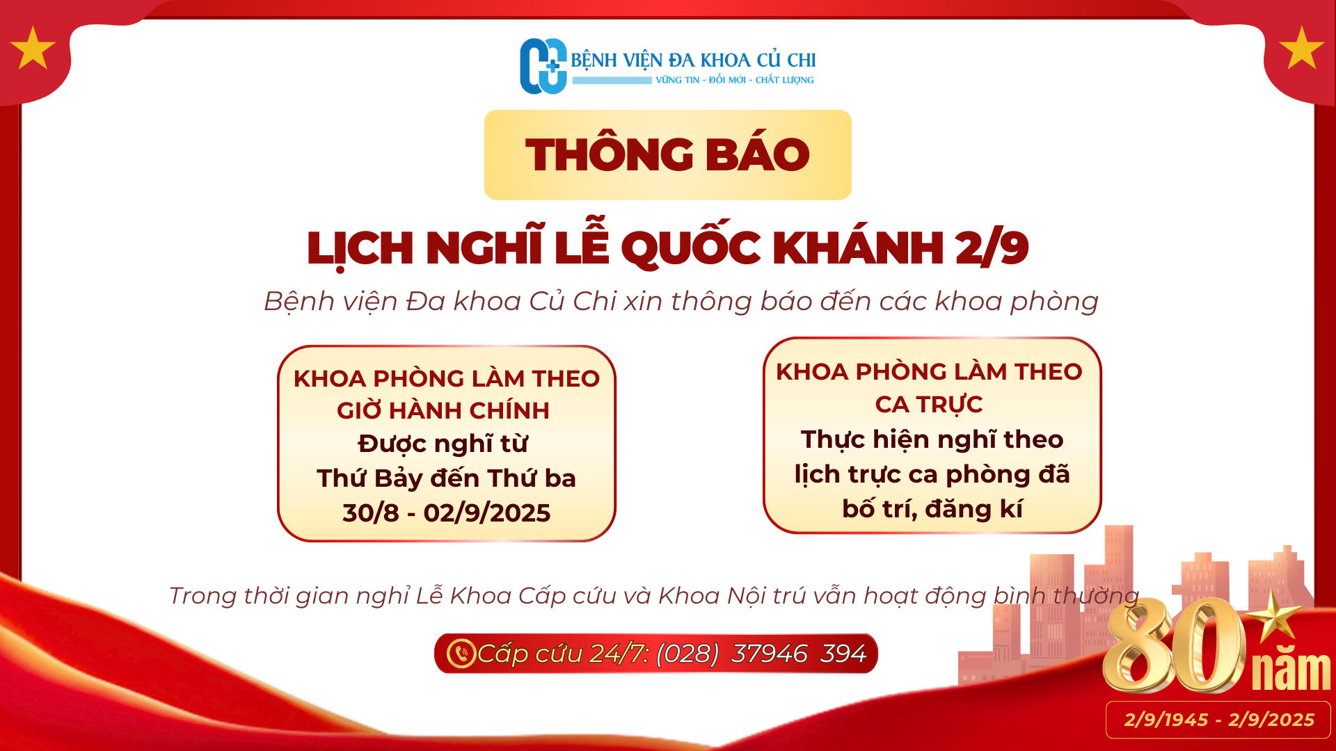 Nhân dịp Kỷ niệm 80 năm Lễ Quốc Khánh 2/9, Bác đọc bản tuyên ngôn độc lập, tại Quảng Trường Ba Đình, Hà Nội ngày (2/9/1945 – 2/9/2025), Bệnh viện Đa khoa Củ Chi xin thông báo lịch làm việc như sau: