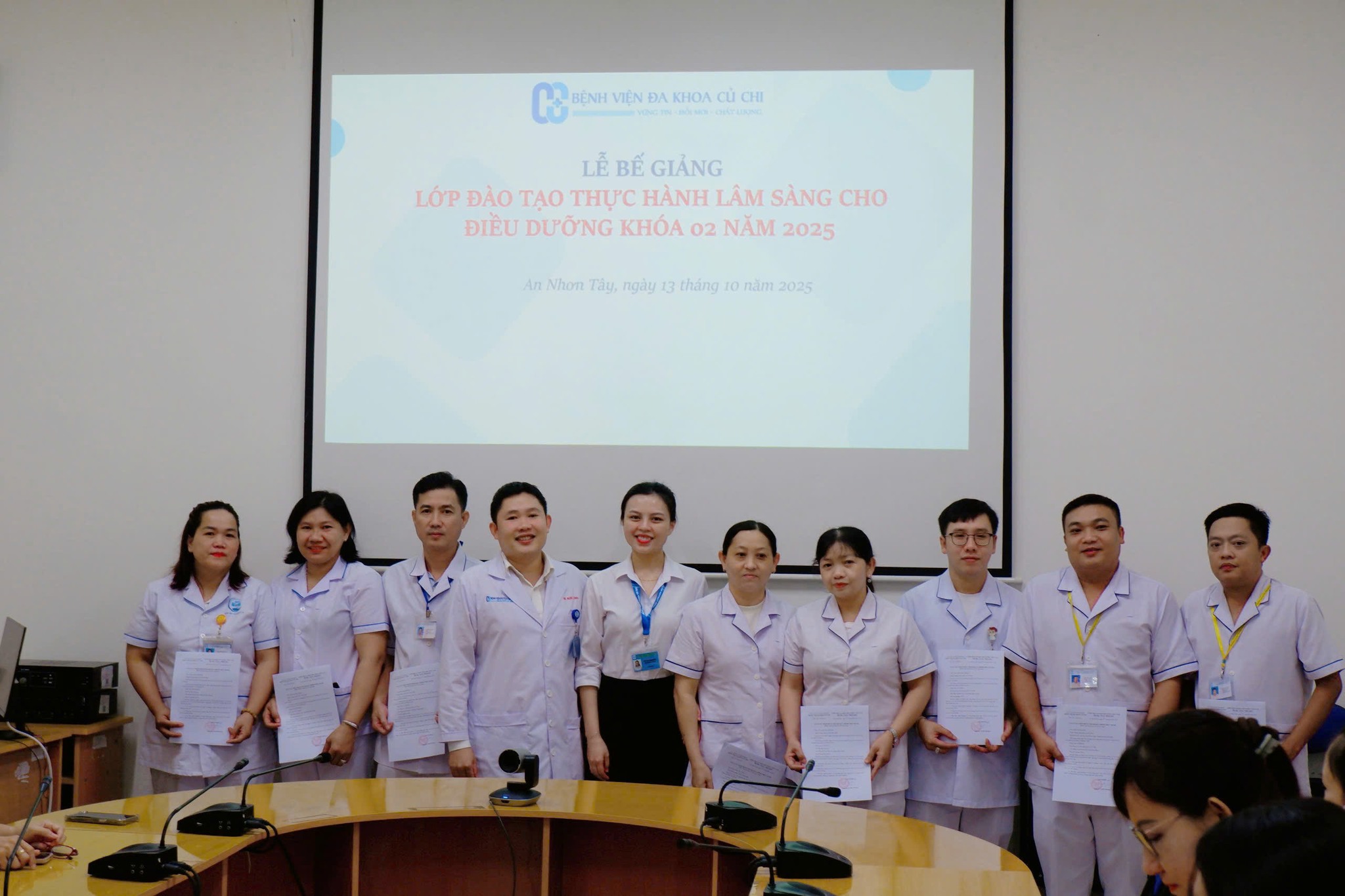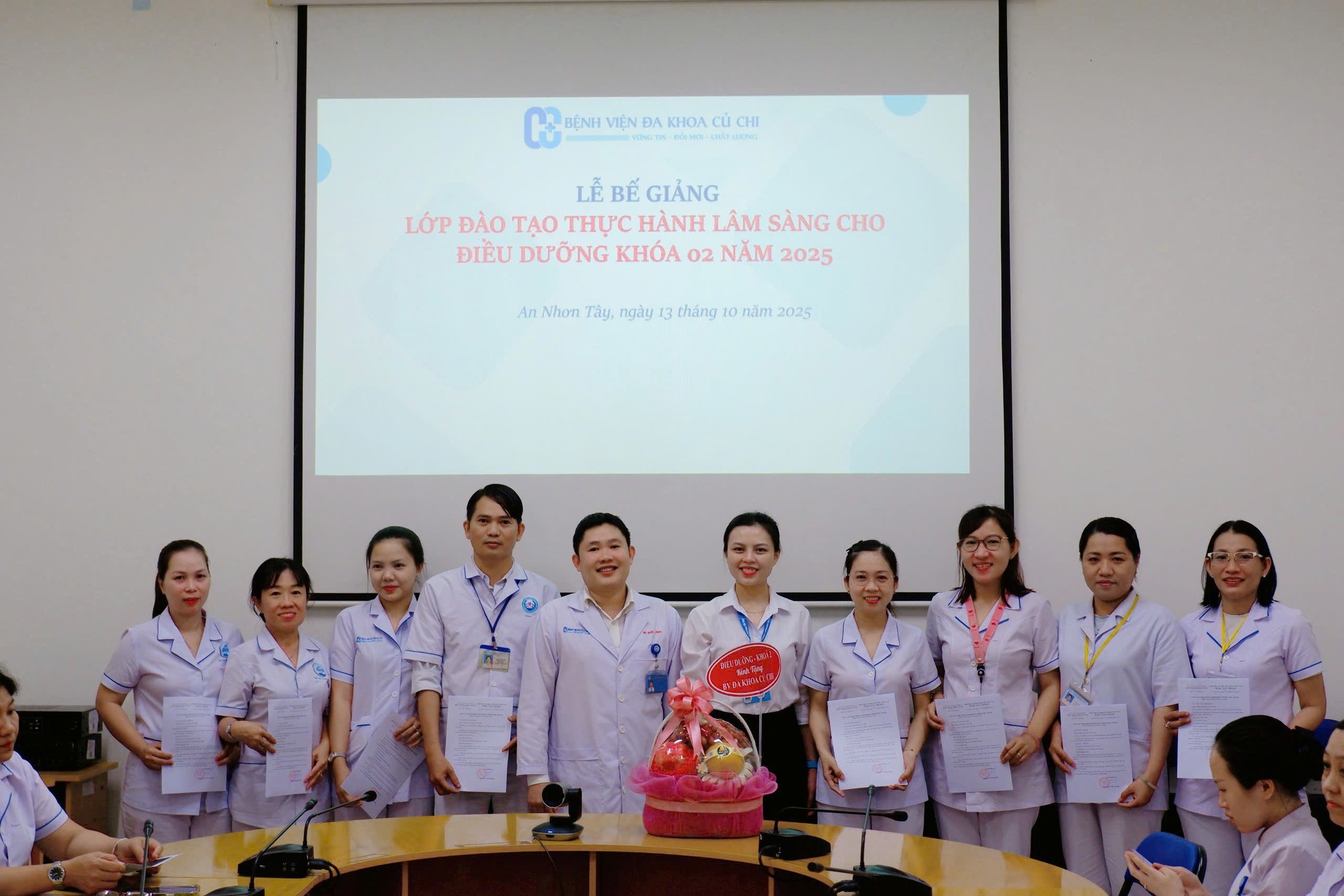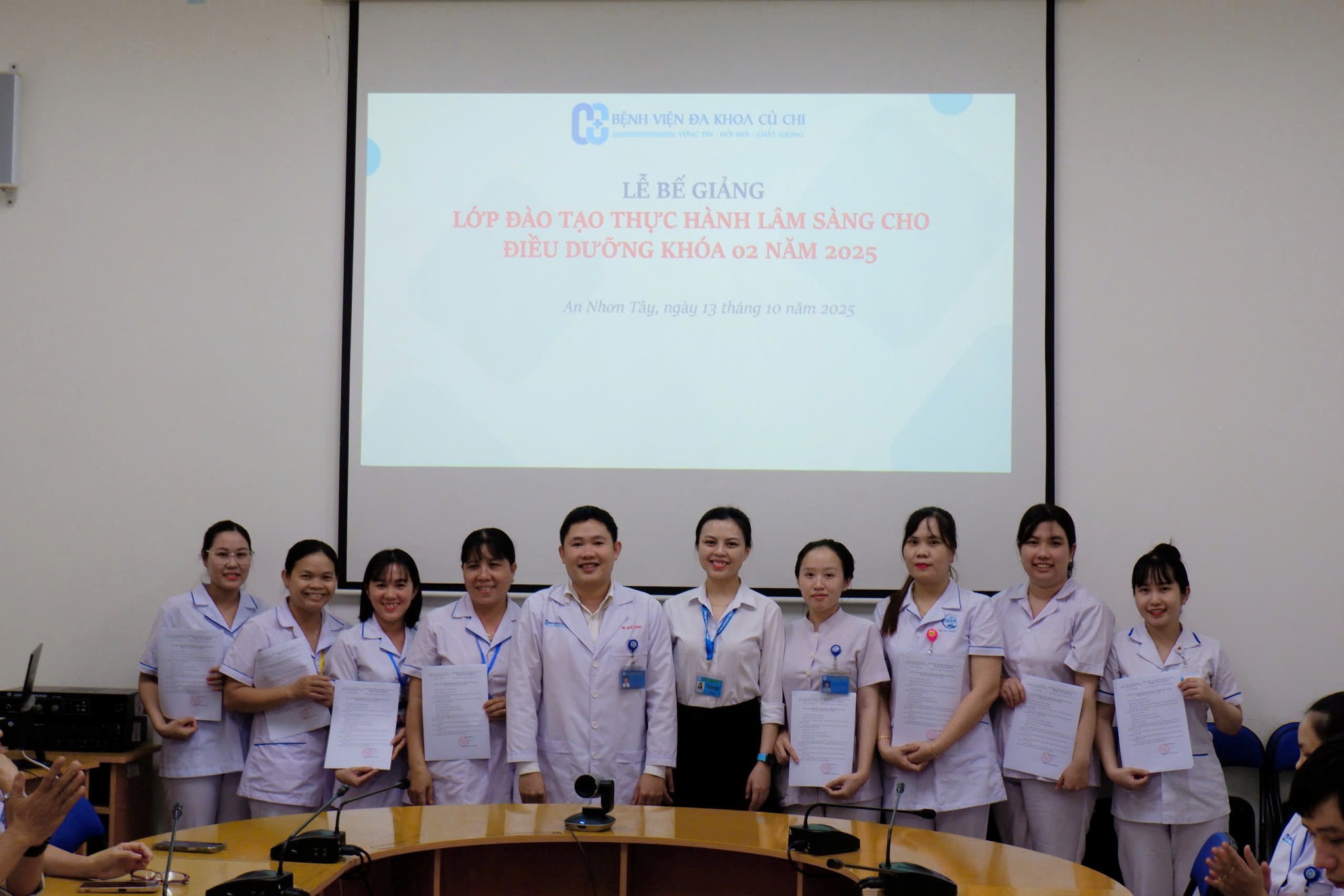 Ngày 13/10/2025, Bệnh viện huyện Củ Chi đã trang trọng tổ chức Lễ bế giảng Lớp đào tạo thực hành cho điều dưỡng – Khóa 02/2025. Đây là dấu mốc quan trọng, khép lại quá trình học tập và rèn luyện nghiêm túc của các học viên dưới sự hướng dẫn tận tâm của đội ngũ giảng viên, cán bộ y tế giàu kinh nghiệm.