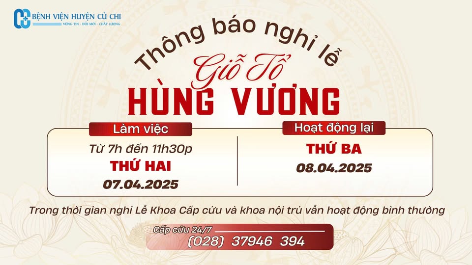 Bệnh viện huyện Củ Chi xin thông báo lịch nghỉ lễ Giỗ tổ Hùng Vương (10/03 AL) như sau:
